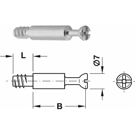 Lot de 10 goujon d’assemblage rastex ; Dimension de perçage B = 24mm ; Longueur du filet L = 15mm ; Trou de perçage = 5mm ; DiamĂštre tĂȘte goujon = 7mm ; Avec fente cruciforme PZ2 ; Acier brut ;