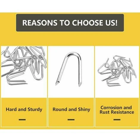 Fer galvanisé de haute qualité : la surface du crampillon grillage est galvanisée, ce qui peut protéger efficacement le clou et ne rouille pas facilement. Le matériau métallique épaissi rend les ongles plus durs et moins déformés. Grace à l’utilisation efficace de clous en U, vous pouvez fixer solidement le fil de fer barbelé et les filets noués sur les poteaux de jardin et les poteaux en bois sans tomber facilement.