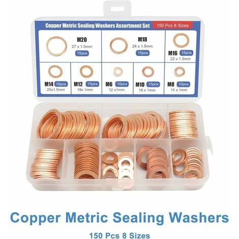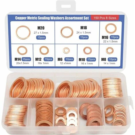 Taille 150PCS joint de combinaison de joint en cuivre en boîte, M6, M8, M10, M12, M14, M16, M18, M20. Livré avec 8 tailles de rondelles plates en cuivre les plus couramment utilisées.