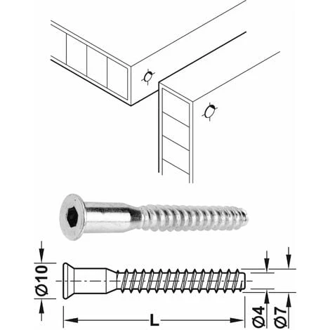 Lot de 20 vis auto-tourillonante confirmat avec tête fraisée ; Empreinte hexagonale creux SW4 ; Diamètre de tige = 7mm ; Longueur = 38mm ; Pour perçage de 5mm ; Acier zingué ; idéal assemblage de planche agglomérée, mélaminée ;
