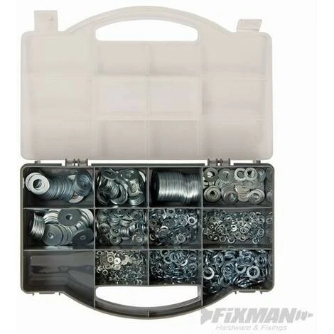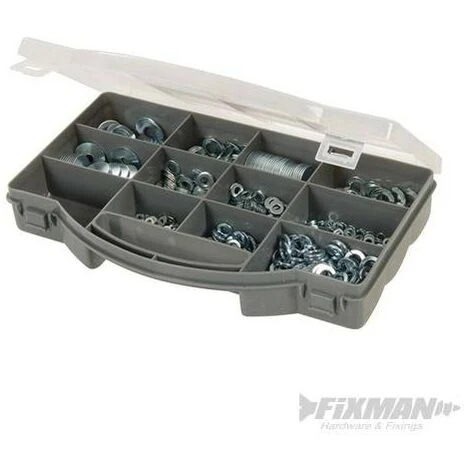 Galvanisées pour résister à la corrosion. Fournis : rondelles ressort M6 – M8 ; petites rondelles M6 x 18 x 1,3 mm et M8 x 25 x 1,6 mm ; rondelles plates M3 x 6, M4 x 8, M5 x 10, M6 x 13, M8 x 16, M10 x 20, M12 x 23 mm. Coffret de rangement compartimenté.