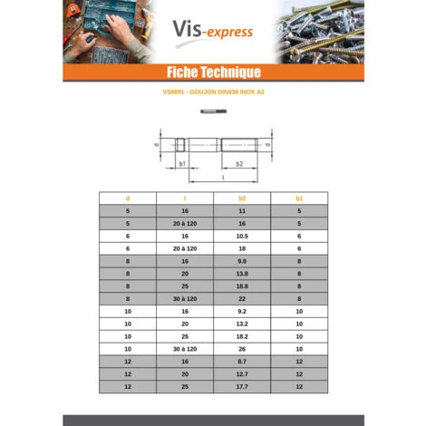 Diamètre = M10, Longueur = 40, Matière = Inox, Norme = DIN938,VS8891, Famille de produits = Goujon