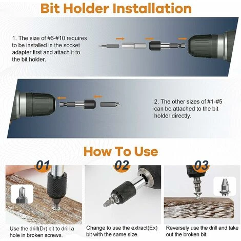 Version améliorée : En plus de 20 tailles différentes de perceuses et d’extracteurs. Ce produit est donc compatible avec n’importe quelle taille de vis/perceuse/boulon, comme les vis tire-fond, les boulons hexagonaux, les vis à bois, etc.