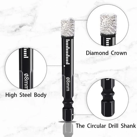 Fonctionne avec toutes les perceuses électriques et meuleuses d’angle. - Stable et Durable : Forets diamantés pour perçage à sec, perçage stable. De plus, il a une longue durée de vie grâce à des diamants de haute qualité et résistants à la température. Le brasage sous vide est le moyen le plus efficace et le plus précis