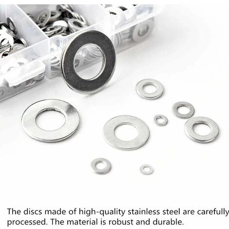 Venez avec une boîte de rangement en plastique pour le stockage. Boîte d’emballage ces petites grilles sont séparées individuellement, ce qui vous permet de retirer facilement des rondelles plates de différentes tailles.