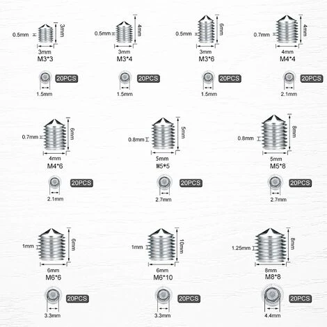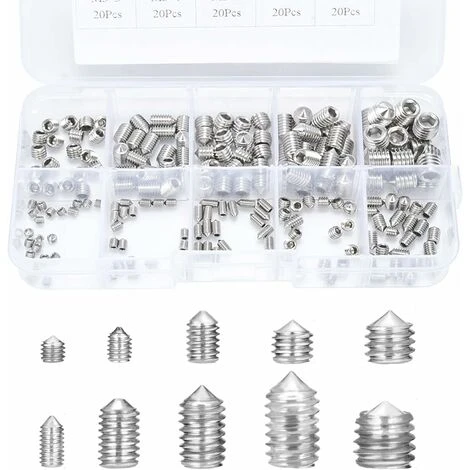 - Paquet 200pcs kits d’assortiment de vis sans tête en acier inoxydable, avec 10 tailles